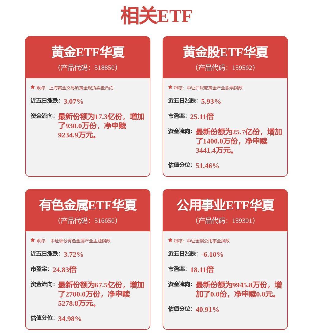 值得注意的是,3月23日金价止跌回升,近日震荡盘整阶段,黄金有色相关ETF获资金持续布局,其中黄金ETF华夏(518850)连续5日获资金布局,累计净流入32847万;有色金属ETF华夏(516650)连续4日吸金,获资金净申购26910万。